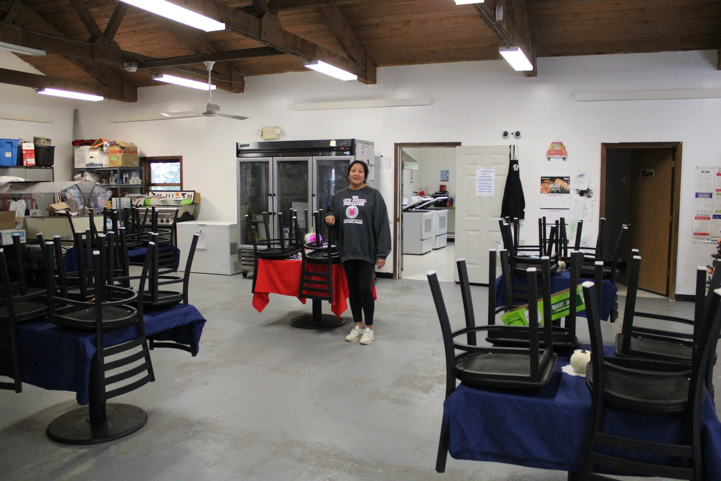 Julie’s kitchen is a cobbled together, but efficient operation. Two home-style ranges. A commercial-grade refrigerator. A chest freezer. A simple pantry, with institutional-variety staples and sundries. The dining room features a concrete floor with four-top tables scattered throughout. The building is impeccably clean and organized, but sparsely decorated. Tablecloths add a meaningful pop of color and elevate the experience of dining in-house. And many do just that. By her count, Julie was feeding more than 100 people a day in the fall of 2024. She serves those who come by and stay for a meal, while also accommodating meals to go, and coordinates deliveries to a number of shut-ins.